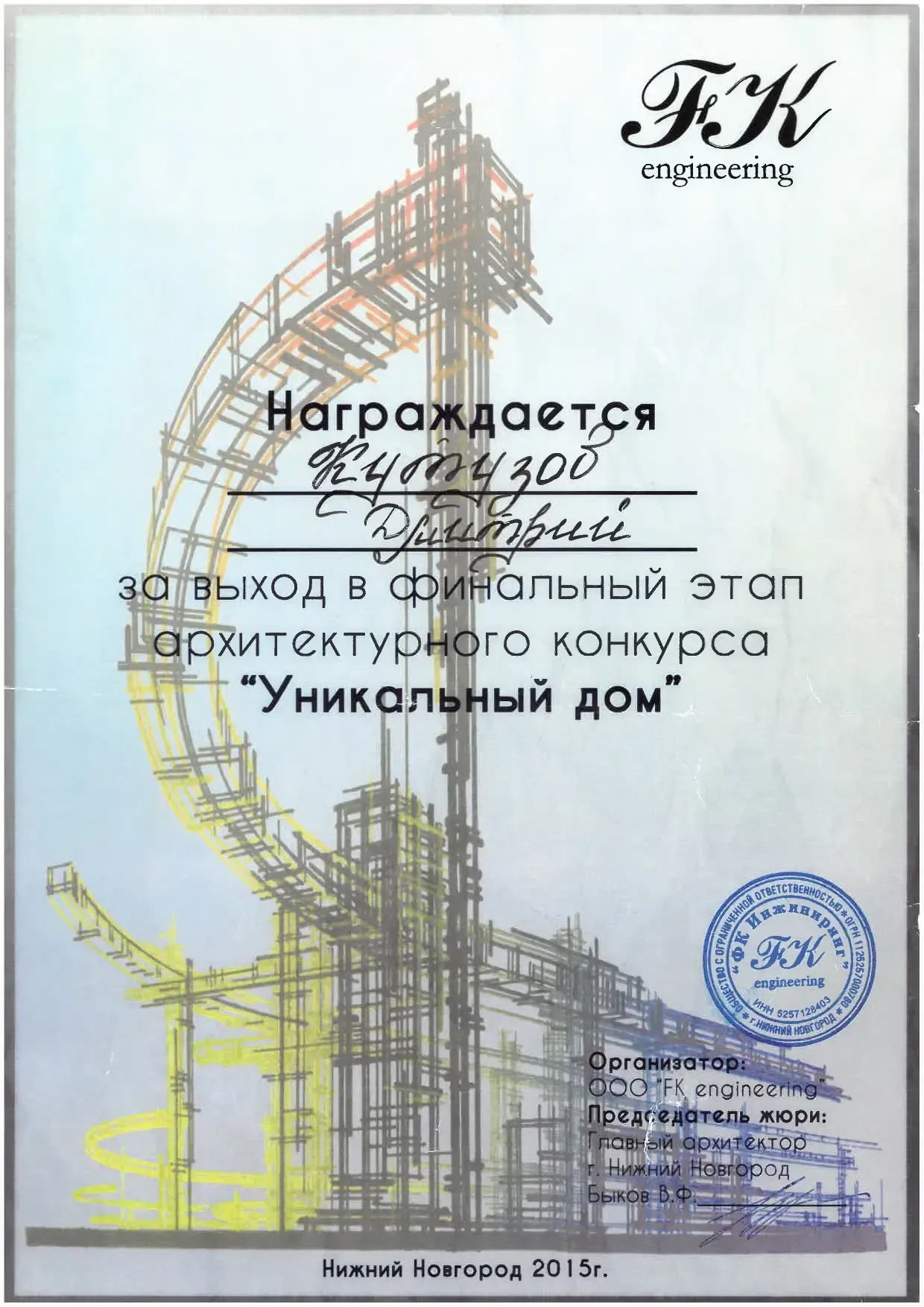Диплом 1 степени в номинации «Архитектура. Профессиональные архитекторы» IV Международного архитектурного конкурса «АрхКонцепция», тема конкурса - «Жилая среда. Новый взгляд»Проект:ЖК «Дзентон»