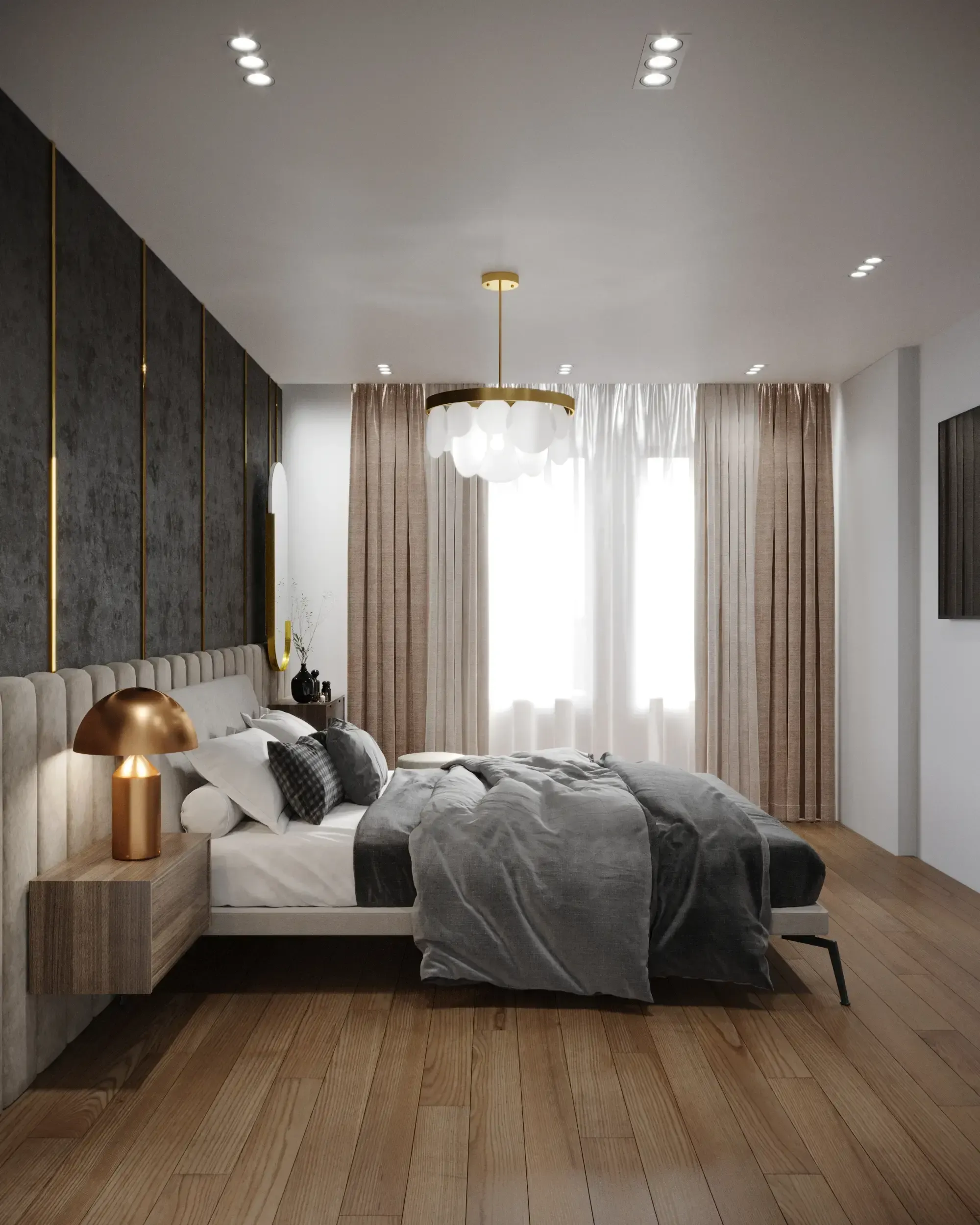 В отделке однокомнатной квартиры преобладают уютные природные оттенки, мягкие и матовые поверхности. Благородные контрасты, сдержанный блеск металлических элементов, акцентные светильники и арт-объекты создают дорогой и изысканный интерьер.