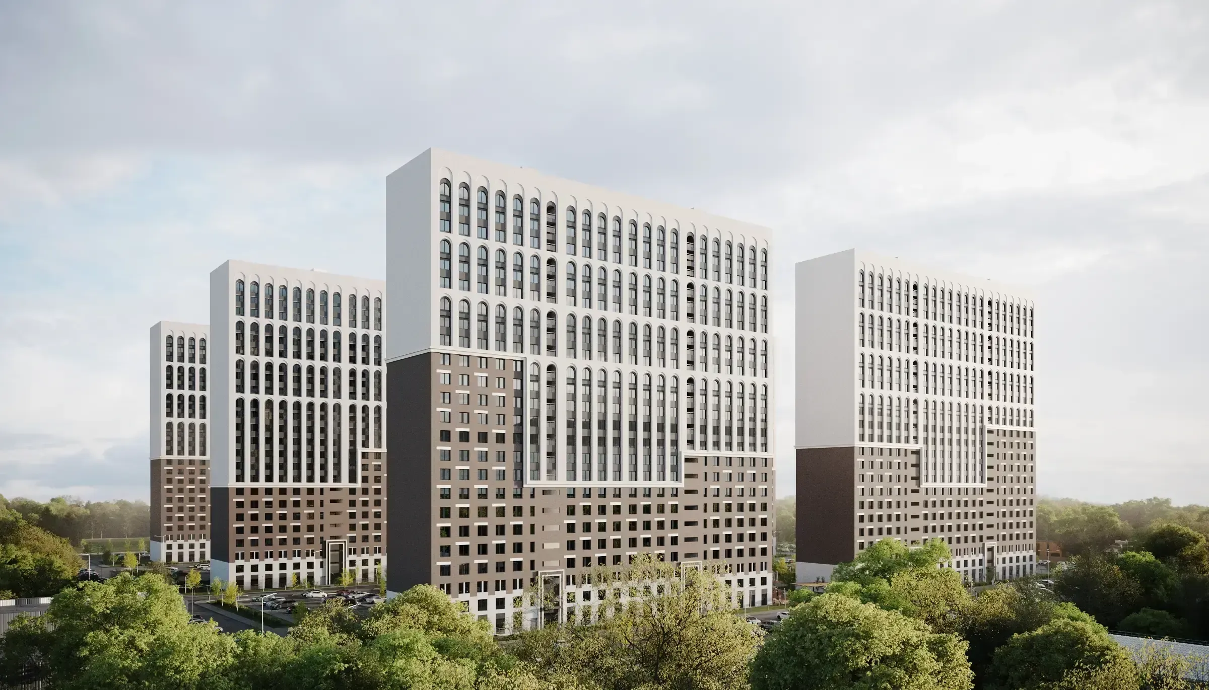 Громоздкие объемы многоэтажных типовых корпусов разделены двумя контрастными цветами. Создана динамичная линия переменной высоты для воссоздания среднеэтажного и малоэтажного профиля города. Арочный декор и арочные окна придают ажурности и легкости фасаду. Входные группы запроектированы нарочито помпезными и торжественными сообразно застройке. Порталы имеют высоту в три этажа и витражное остекление.
