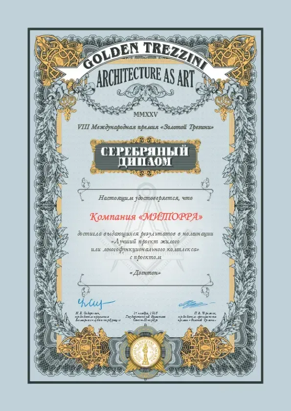 Серебряный диплом в конкурсе "Золотой Трезини - 2025" - "Лучший проект жилого или многофункционального комплекса"Проект:ЖК «Дзентон»