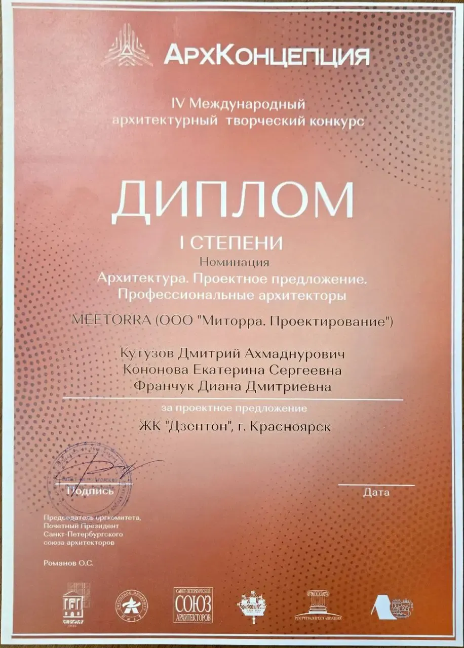 Диплом 1 степени в номинации «Архитектура. Профессиональные архитекторы» IV Международного архитектурного конкурса «АрхКонцепция», тема конкурса - «Жилая среда. Новый взгляд»Проект:ЖК «Дзентон»
